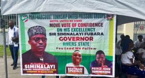 Placards at the canopies boldly display solidarity messages for Governor Siminalayi Fubara of Rivers State.