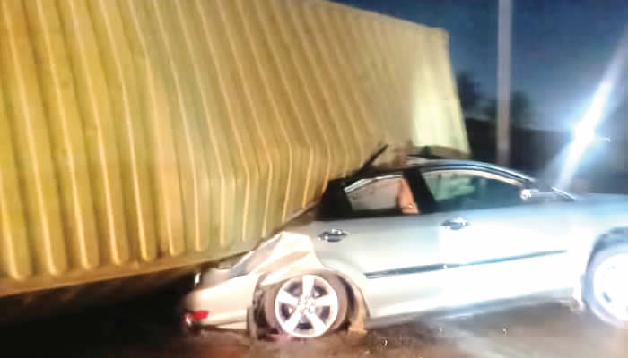The accident, which was a visible call on the Isolo Fire Station of the Agency at about 18:35 hours Wednesday, at the busy Toyota bus stop on the Apapa—Oshodi Expressway inward Isolo, Lagos, had one of the containers accidentally fall on the rear side of the vehicle while on motion, prompting sympathisers to come to their aid before firefighters teamed up to bring them out of the accident unhurt.