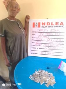 A 72-year-old grandma Mrs. Christy Ejaro was on Tuesday 24th June arrested by NDLEA operatives at Niger CAT area of Warri, Delta state. Several sachets of skunk packaged in retail size were recovered from her.