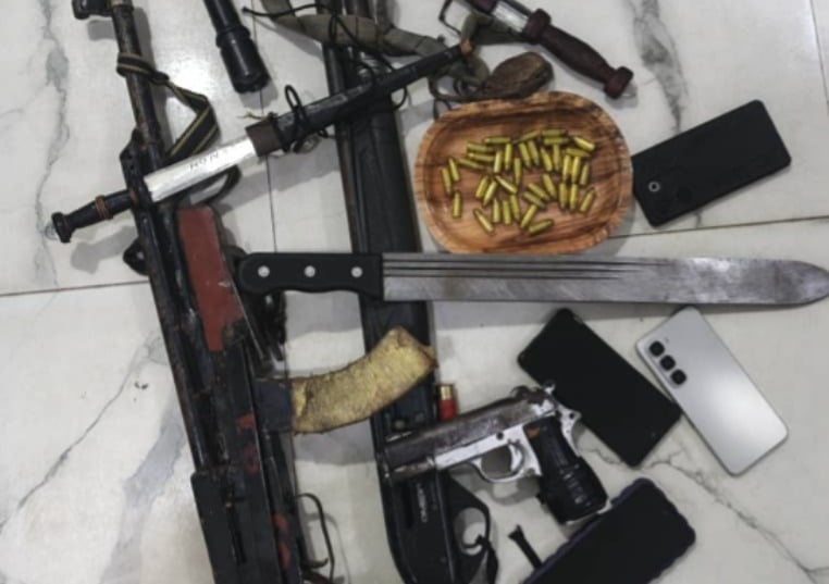 “Recovered exhibits include: one (1) fabricated AK-47 rifle; thirty-six (36) rounds of 9mm live ammunition; one (1) locally made pistol; one (1) pump-action gun; two (2) live cartridges; four (4) mobile phones of the victims; two (2) sharp knives; one (1) cutlass; nine (9) torchlights used during the operation.”