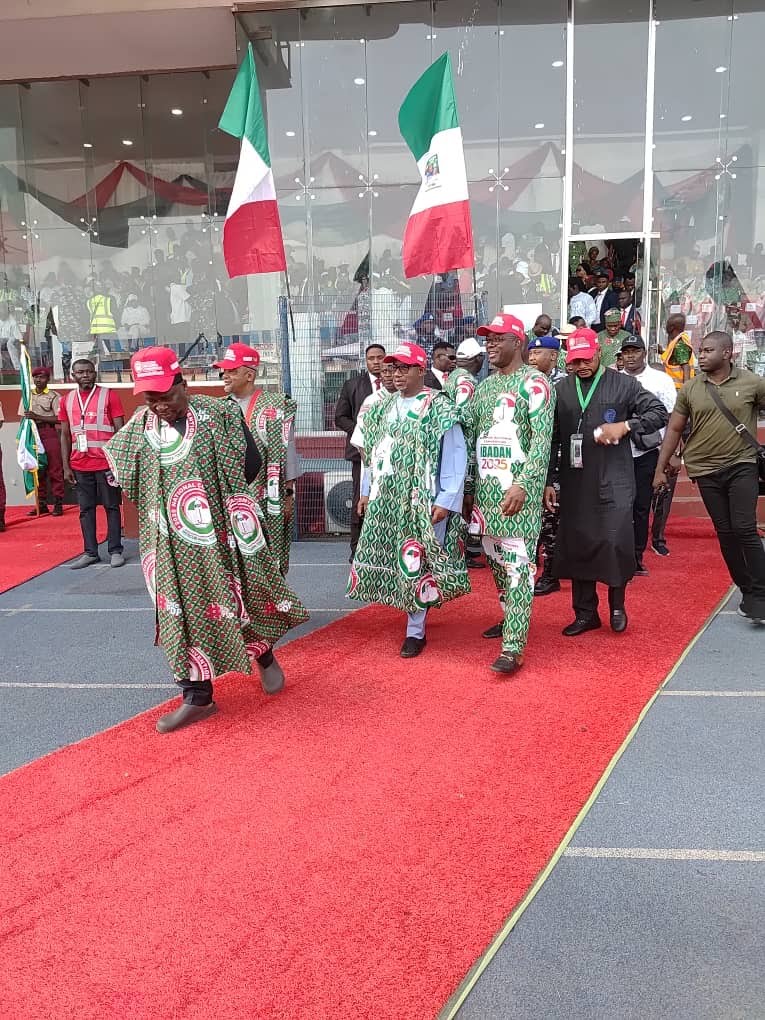 Ambassador Umar Damagum, factional National Chairman of the Peoples Democratic Party (PDP) and host Governor Seyi Makinde of Oyo state have led other three other Governors to the Lekan Salami Stadium, Adamasingba, venue of the Elective National Convention of the party.